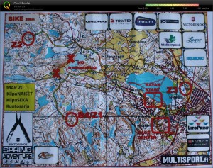 Prologin jälkeen edessä oli sitten varsinaisen kisan alku. Matkaan lähdettiin takaa-ajolähtönä ja me noin 17min kärjen perään. Alkumatkasta navigaattorina toimi enimmäkseen Petteri pyörätiekarttansa avulla ja itse lähinnä seurailin omasta kartasta missä mennään. Matka taittui hyvin ihan 2:s rastin lähelle mutta uusi kartasta puuttuva sähkömuuntamo oli katkaissut pyörätien ja jouduttiin kääntymään takaisin sekä hakemaan paremman reitin rastille. Matka jatkui pois päin kaupungista ja päästiin jo hieman polkemaan metsänkin puolelle. Yhdellä välillä äkäinen ruotsalaisrouva huusi jotain yksityisalueesta mutta onneksi ei osata ruotsia eikä siten mitään sellaisesta tietenkään tiedetty 🙂 4-5 välille oltiin suunniteltu suorempi reitti mikä osoittautui isoksi virheeksi... Ensin loppui tie ja sitten polkukin pikkuhiljaa hävisi alta. Onneks pienen etsimisen jälkeen taas löytyi. Matka rastille oli tosin hidasta pieniä polkuja pitkin ja aikaa meni hukkaan. Väli olisi pitänyt mennä hieman kiertäen isompia teitä pitkin. Loppumatka ensimmäiselle vaihtopaikalle meni rennosti rullaillessa.